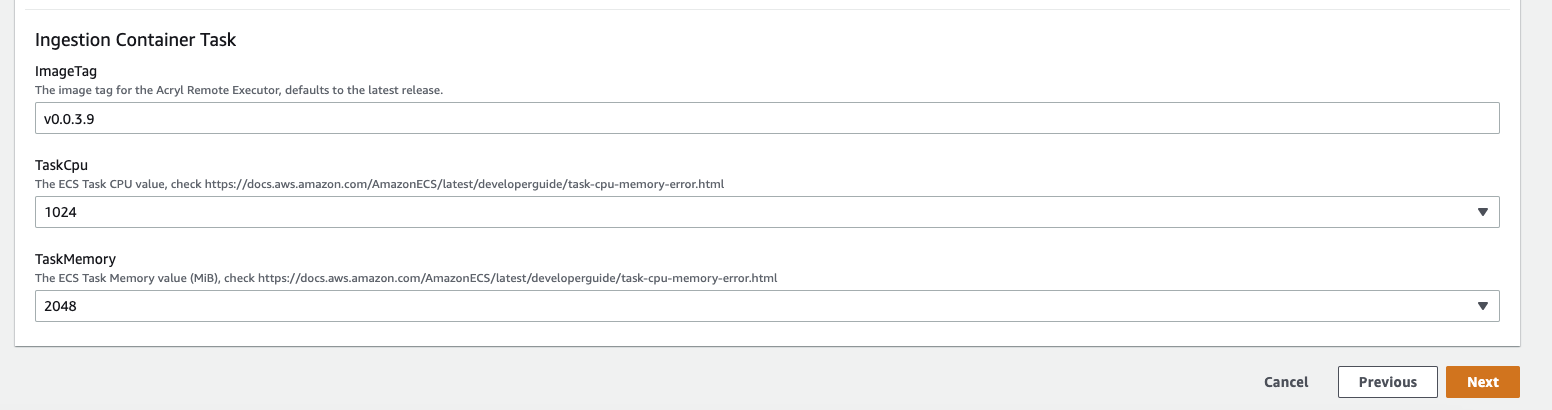 2. Provision an Acryl Executor (ECS): Acryl team will provide a Cloudformation Template that you can run to provision an ECS cluster with a single remote ingestion task. It will also provision an AWS role for the task which grants the permissions necessary to read and delete from the private SQS queue created for you, along with reading the secrets you've specified. At minimum, the template requires the following parameters: